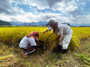 去年みんなで植えた稲が、今年も立派に実っていました。